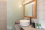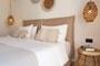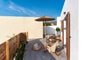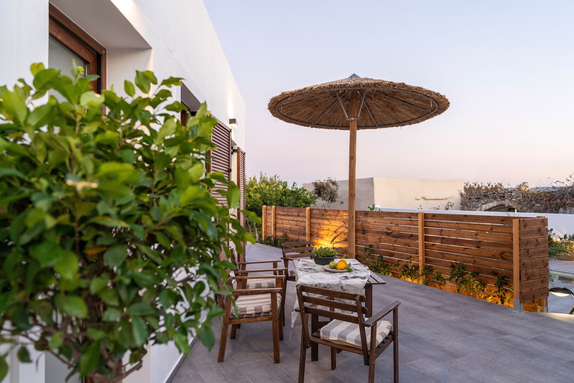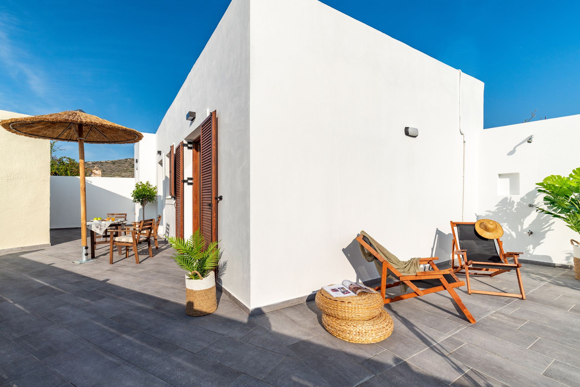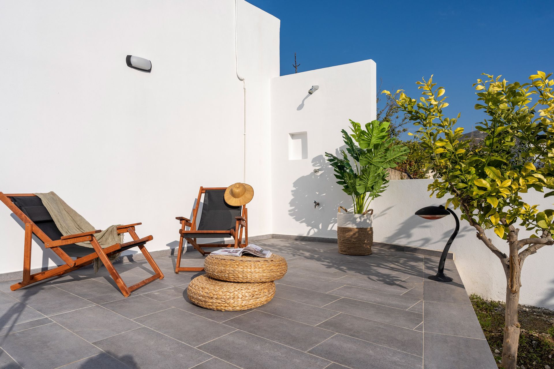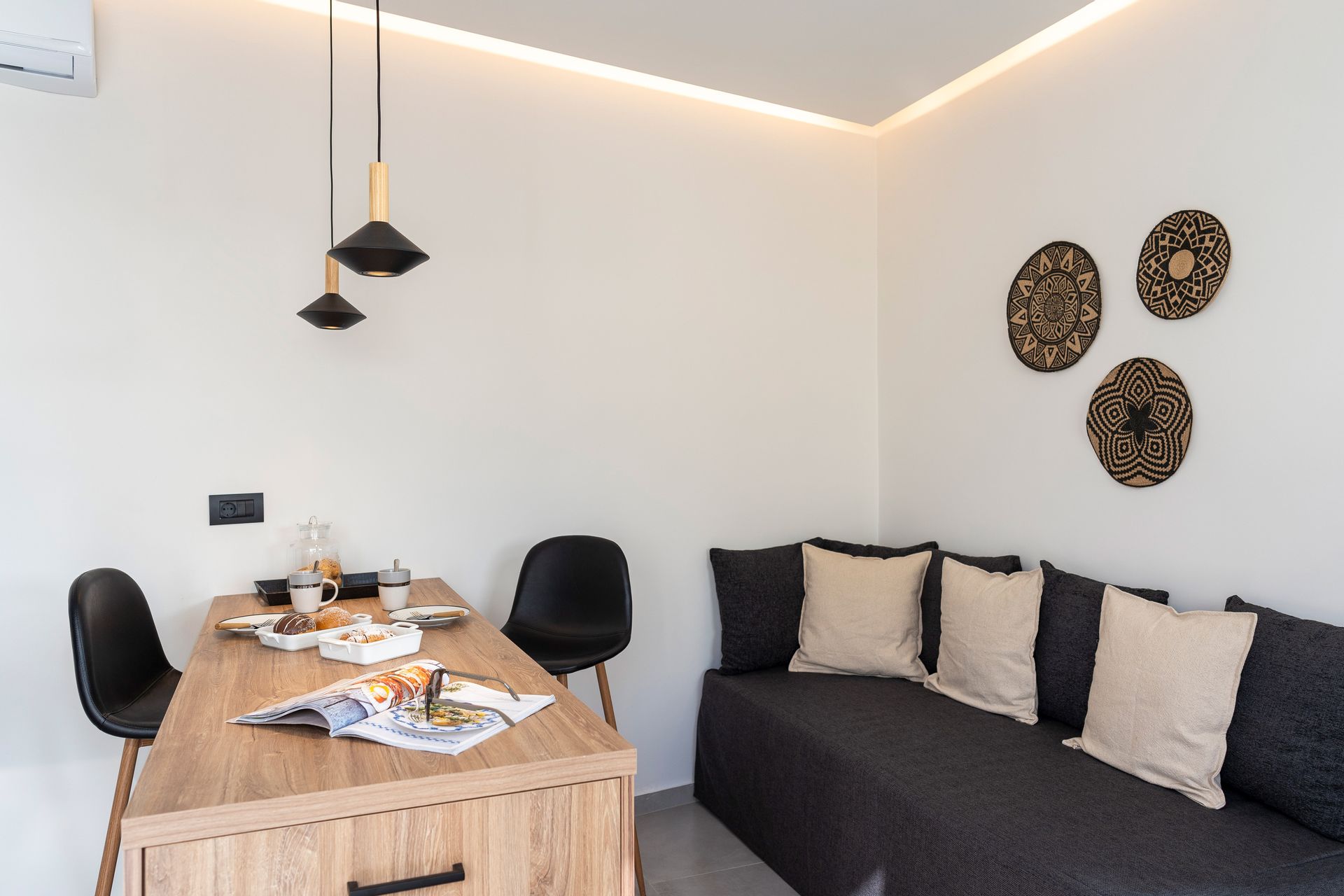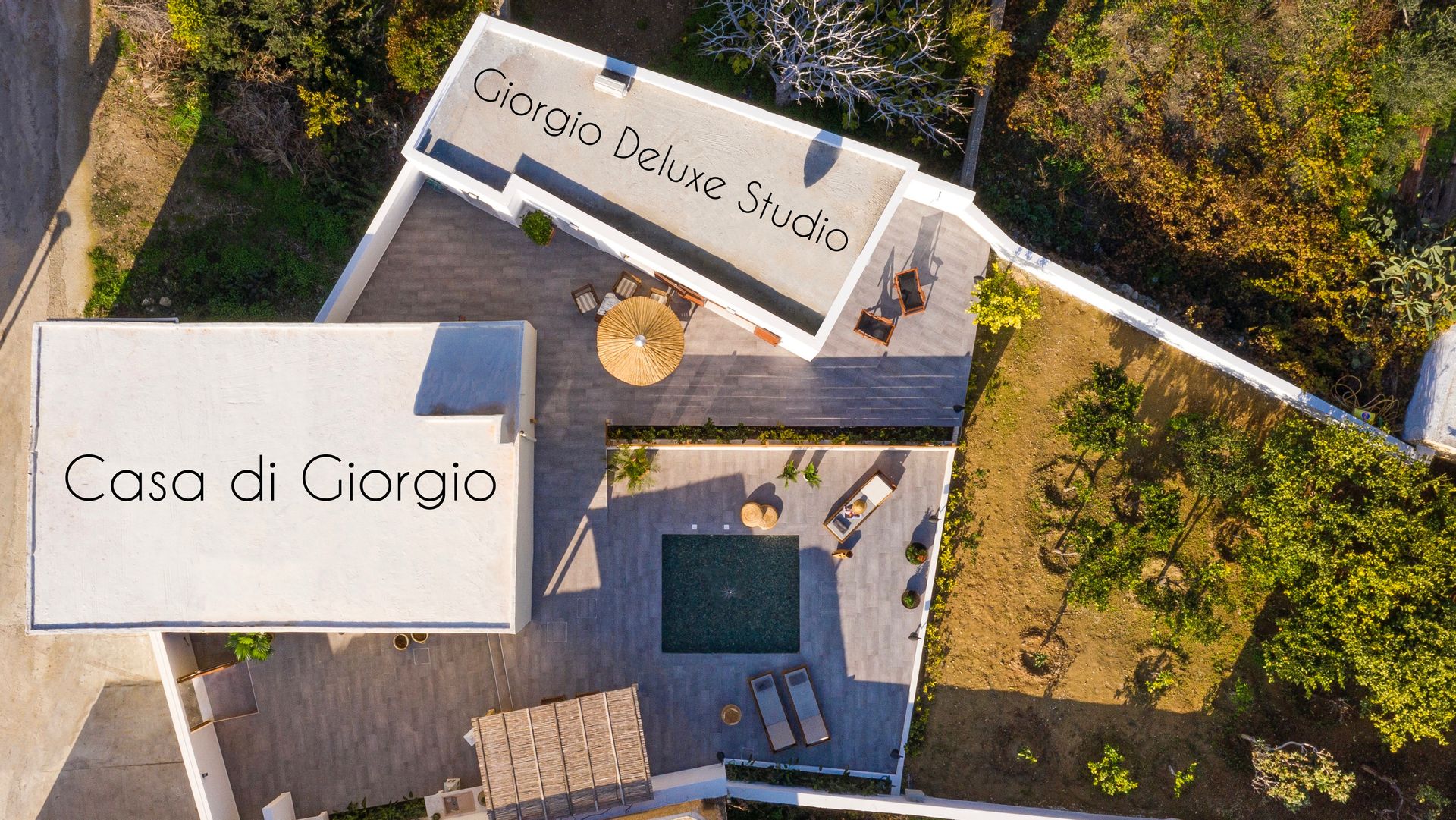 Overlooking the garden Giorgio deluxe studio has a spacious bedroom with comfortable matresses a Queen size bed, a 42'' HD TV, an A/C , a big open wardrobe and a fully equipped kitchen with all the amenities to prepare your meals.In addition an extra single bed its available in the kitchen area with A/C to accommodate the 3rd person. Outside it's elegantly decorated to fill up your expectations with a fully furnished private terrace, a beautiful fountain and an outside shower.